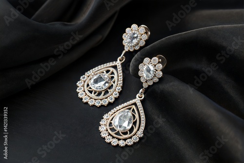 Fototapeta premium Women’s elegant gemstone earrings against a black background, captured with high clarity (Diamond)