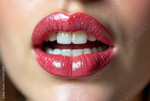 © Limanou Mikael, Obraz premium Women's mouth with painted lips and snow-white teeth.