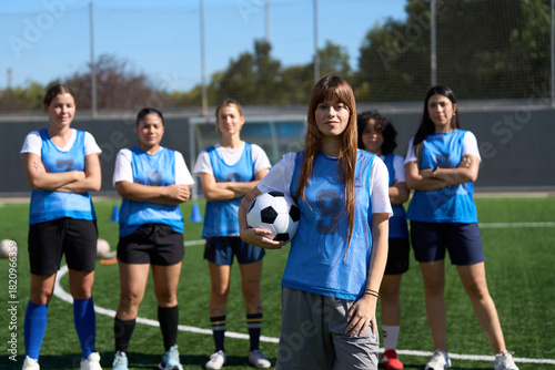 Obraz premium Women's soccer team leader holding ball