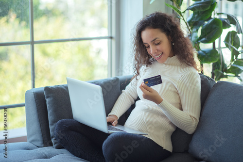 © LOVEis, Naklejka premium Women shopping online. Latin women are happy with online shopping.