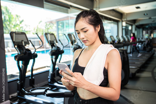 © Johnstocker, Fototapeta premium Women standing playing the phone happily in the gym.
