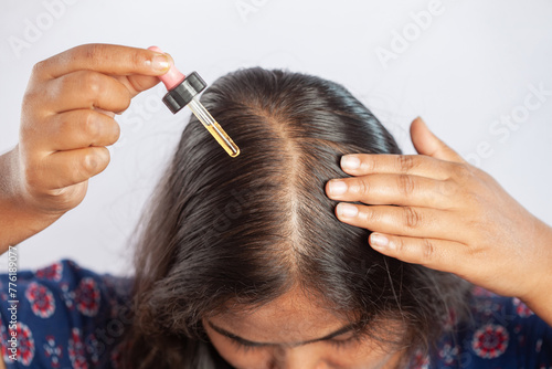 Naklejka premium women suffering from hair loss using hair serum or minoxidil to treat alopecia