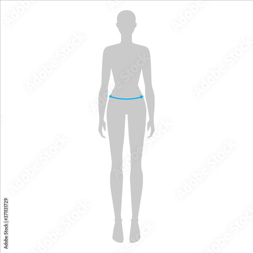 © Vectoressa, Naklejka premium Women to do lower waist measurement fashion Illustration for size chart. 7.5 head size girl for site or online shop. Human body infographic template for clothes.