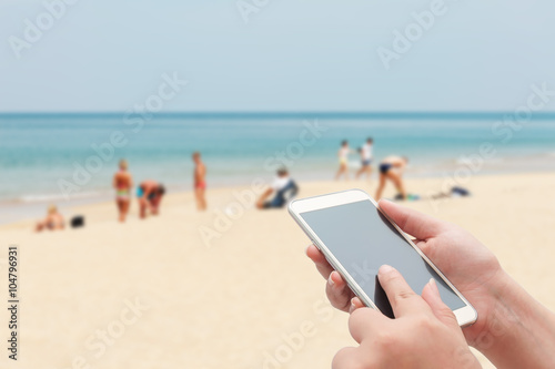 Naklejka premium Women using smartphone top on blurred blue sea and white sand be