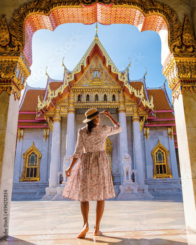 Obraz premium women walking at Wat Benchamabophit temple in Bangkok Thailand, The Marble...