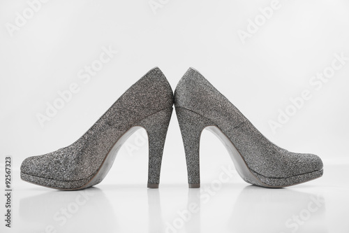 © kelifamily, Obraz premium Womens silver high heels on white background