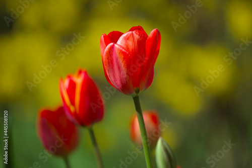 Fototapeta premium Wonderful bright red tulips with green and yellow bushes in the background. Spring flowers on a warm sunny day. Close-up.