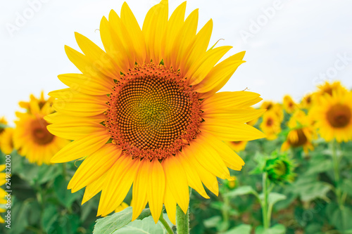 Fototapeta premium Wonderful bright yellow sunflower on the field of blooming sunflowers