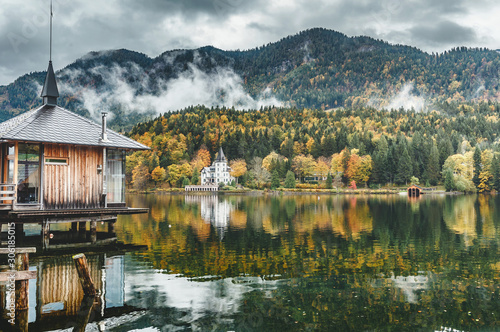 Fototapeta premium Wonderful Foggy sunset over the lake in mountans.