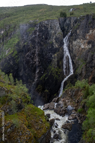 © Maurizio, Fototapeta premium Wonderful landscapes in Norway. Vestland. Beautiful scenery of Voringfossen waterfall in the Mabodalen valley on the Hardanger scenic route. Mountains, trees in background. Cloudy day. Selective focus