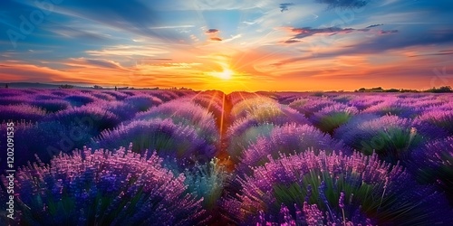 © Pagal, Fototapeta premium Wonderful nature vacation landscape amazing sunset scene blooming lavender flowers Moody sky pastel colors on bright landscape view