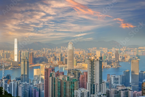 Naklejka premium Wonderful panoramic of Hong Kong city view from Victoria Peak, modern cityscape during sunset in the evening with amazing clouds.