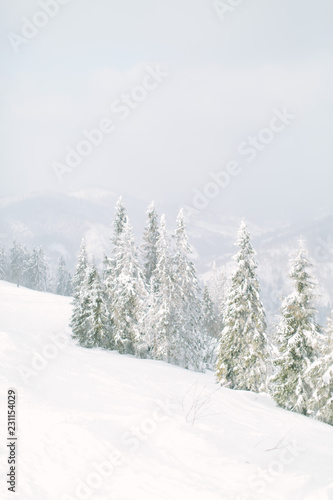 Naklejka premium Wonderful photo of winter snowy forest. Mountains in winter. Christmas trees...