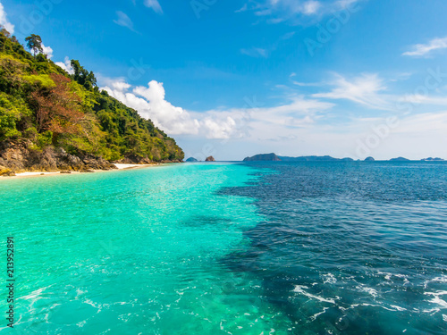© penkanya, Fototapeta premium Wonderful seascape. Clear turquoise sea, forest mountain and blue sky.