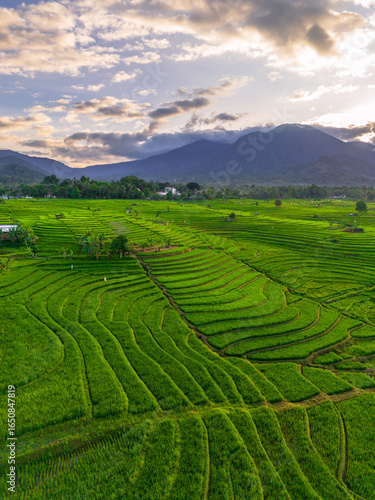 Fototapeta premium Wonderful sunrise scenery indonesia nature mountain valley forest with bright...