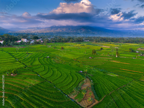 Fototapeta premium Wonderful sunrise scenery indonesia nature mountain valley forest with bright...