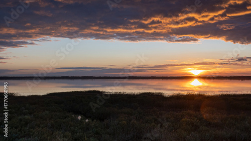 © ANDA, Fototapeta premium wonderful sunset by the lake, autumn landscape, sun rays reflecting on the calm surface of the lake