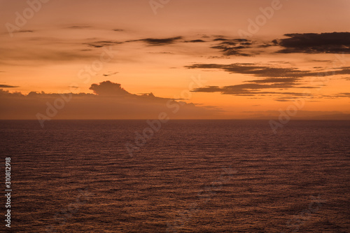 © WellStock, Naklejka premium Wonderful sunset in Cyprus, Cape Greco. Calm dark sea and orange sky with clouds