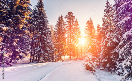 Naklejka premium Wonderful wintry landscape. Winter mountain forest. frosty trees under warm...