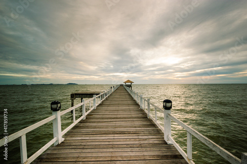 © chanin, Naklejka premium wood bridge in evening at Casaluna village in Thailand , wooden pier on the beach ,Wooded bridge in the port between sunrise.