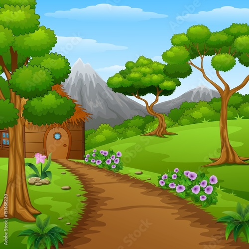 Naklejka premium Wood cabin in the countryside with mountains and dirt road