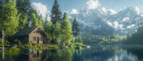Fototapeta premium Wood cabin on the lake - log cabin surrounded by trees, mountains, and water in natural landscapes