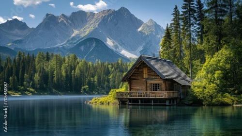 Fototapeta premium Wood cabin on the lake - log cabin surrounded by trees, mountains, and water in natural landscapes