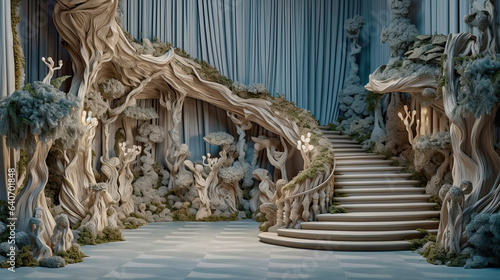 © Reha, Fototapeta premium Wood carved staircase and stage backdrop for wedding and maternity photography