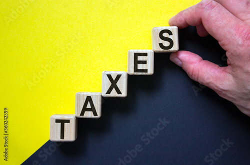 Obraz premium Wood cubes with word 'taxes' stacking as step stair on paper yellow and black...