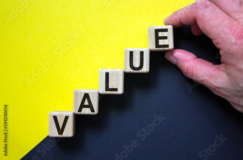 © Dzmitry, Obraz premium Wood cubes with word 'value' stacking as step stair on paper yellow and black background, copy space. Male hand. Business concept success process.