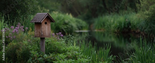 Obraz premium Wood duck nesting box placed in verdant tranquil wetland environment with abundant vegetation