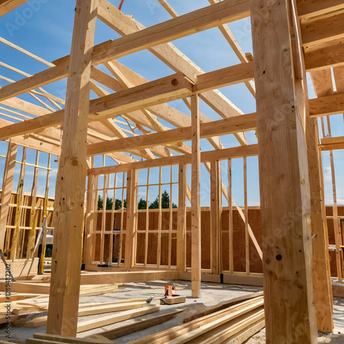 © Aleksandra, Obraz premium "Wood Frame Under Construction" Focused image of wood beams and posts being assembled during the early stages of home construction.