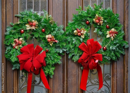 © Spiroview Inc., Fototapeta premium Wood grain double front door with wreath made of pine branch with red ribbons