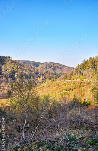 Fototapeta premium Wood in the mountains with trees in the forest under a blue sky.