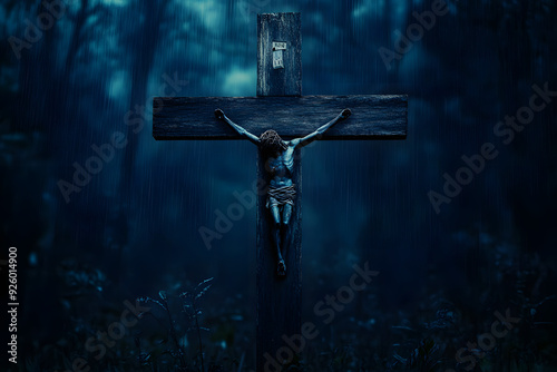 Naklejka premium wood jesus cross, dark black blue horror night background, scary haunted thriller theme, good friday,