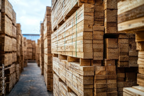 © LimeSky, Fototapeta premium Wood planks stacked at lumber warehouse Timber air drying for construction industry