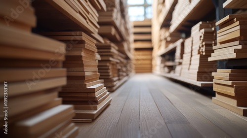 © Randu, Fototapeta premium Wood planks stacked in warehouse.