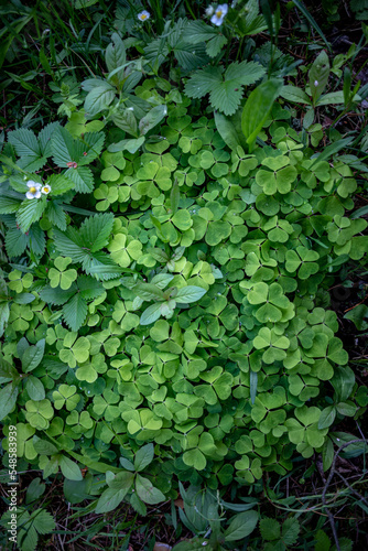 Obraz premium wood sorrel and blooming wild strawberries on forest ground