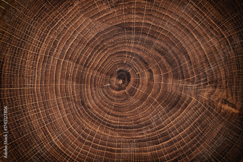 © dmitr1ch, Naklejka premium wood texture with annual rings, cracked surface of a felled stump background