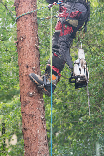 © Tom Baur, Fototapeta premium wood worker on a tree cutting wood with a chainsaw