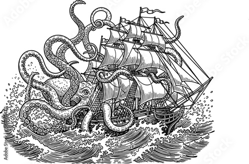 Fototapeta premium Woodcut illustration of a giant octopus attacking a ship. Vintage grunge vector design element for artworks, poster, cards, web and collages.