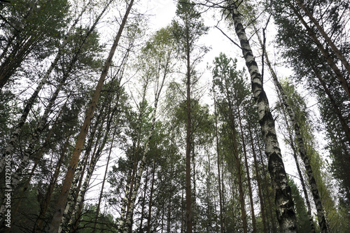 © baon, Fototapeta premium Wooded forest trees backlit by golden sunlight before sunset with sun rays pouring through trees on forest floor illuminating tree branches