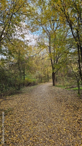 Obraz premium Wooded Path Covered with Yellow Fallen Leaves in Autumn Park (노란 낙엽으로 덮인 가을 공원 숲 오솔길)