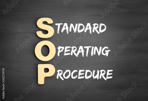 © dizain, Obraz premium Wooden alphabets building the word SOP - Standard Operating Procedure acronym on blackboard