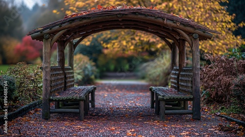 © NicotineLens , Obraz premium Wooden Arbor with Benches in an Autumnal Park
