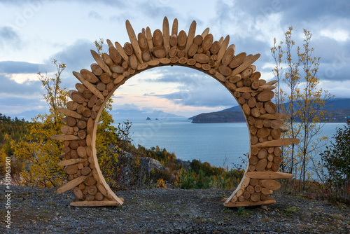 © Andrei Stepanov, Fototapeta premium Wooden arch at the observation deck. Evening view of the sea. In the distance is a cape and rocks in the sea. Ecological tourism and nature travel. Gertner Bay, Sea of Okhotsk, Magadan region, Russia.