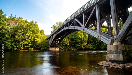 © kani, Obraz premium Wooden arch bridge over a river with autumn foliage