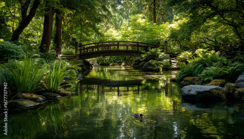 Fototapeta premium Wooden arched bridge spans tranquil pond surrounded by rich green trees,...
