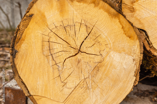 © ARVD73, Naklejka premium Wooden background.Closeup of round slice of tree with annual rings and cracks. Natural organic texture. Flat surface. Close-up view of yellow tree log cut end. Round cut tree.Macro wood cross section.