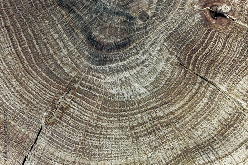Fototapeta premium Wooden background with the surface texture of a natural polished sawn cut of old oak wood with annual rings close-up